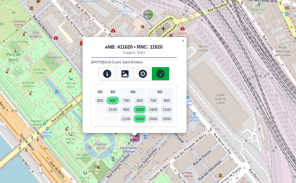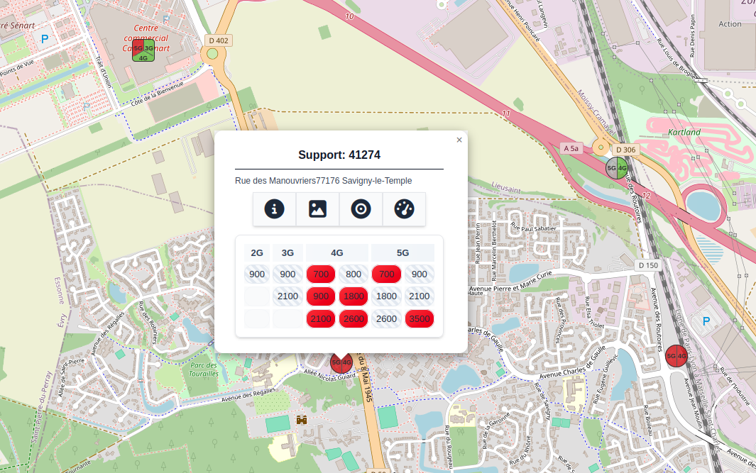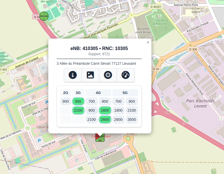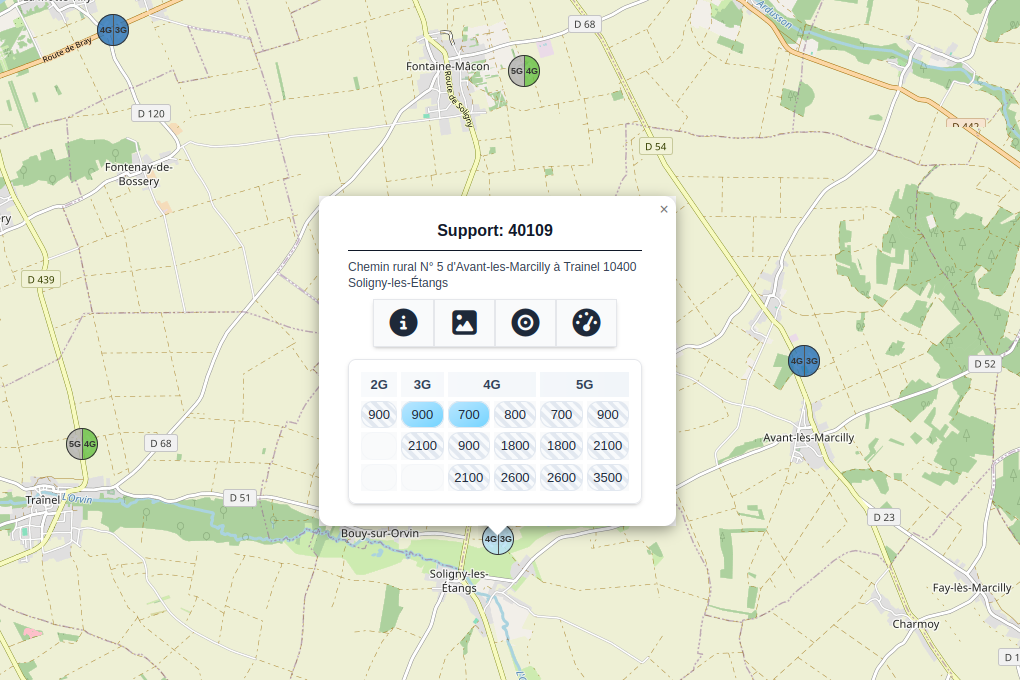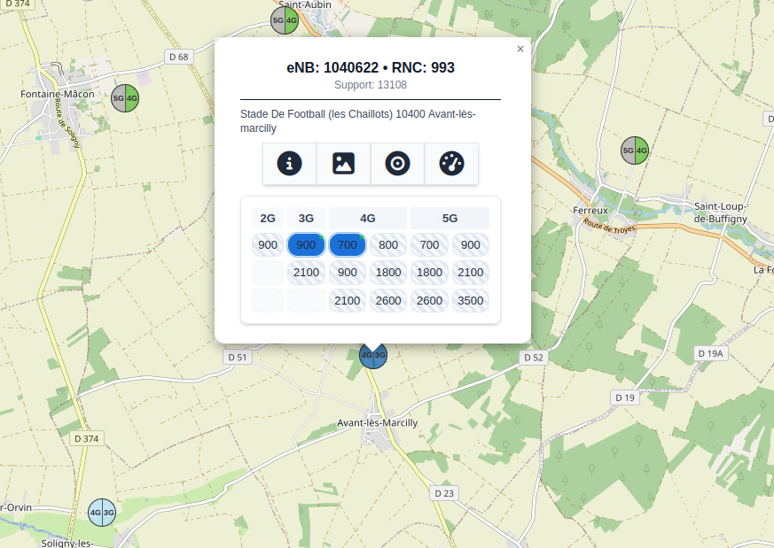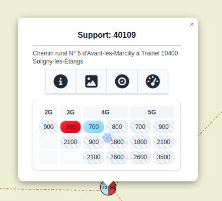 Ils sont représentés par un petit carré partagé en trois secteurs représentant les 3 technologies utilisées (3G, 4G & 5G).