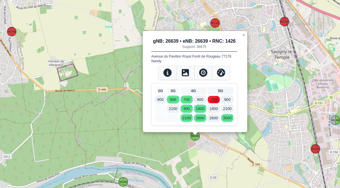 Chaque technologie est marquée d’une couleur représentant l’état d’avancement du site pour cette technologie selon les données de l’ANFR et le progrès de la collecte de la communauté RNCmobile :