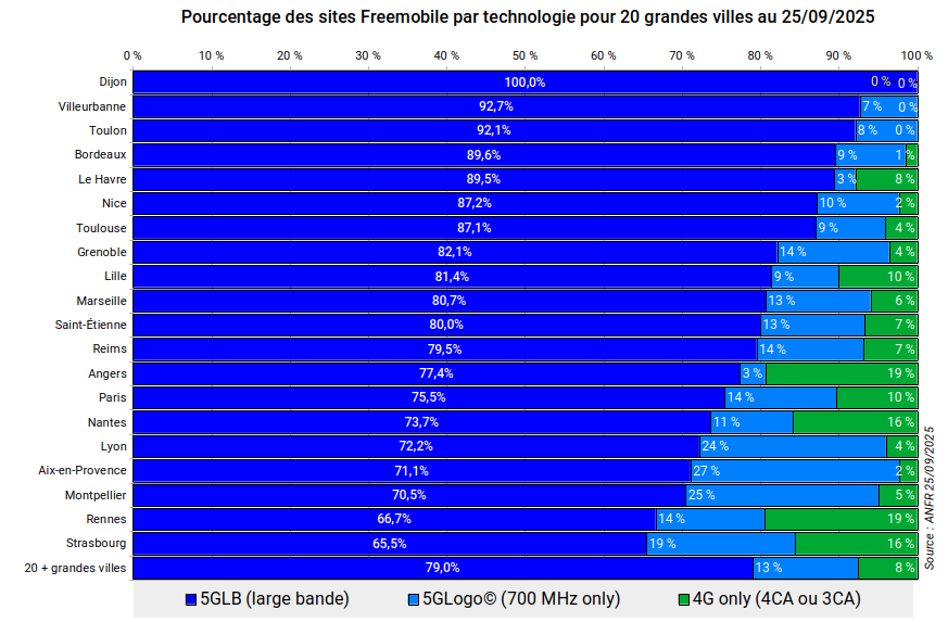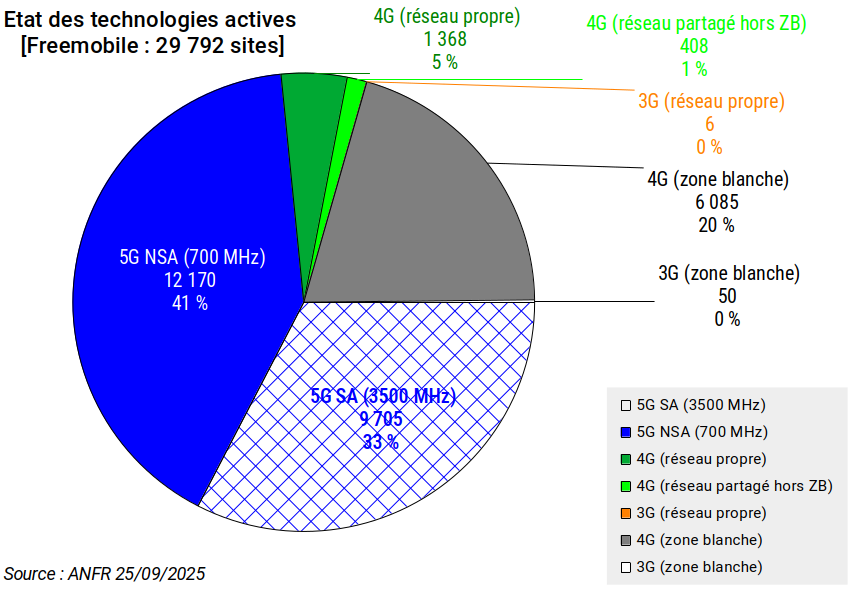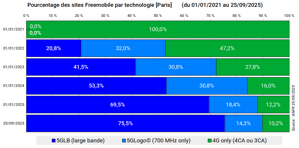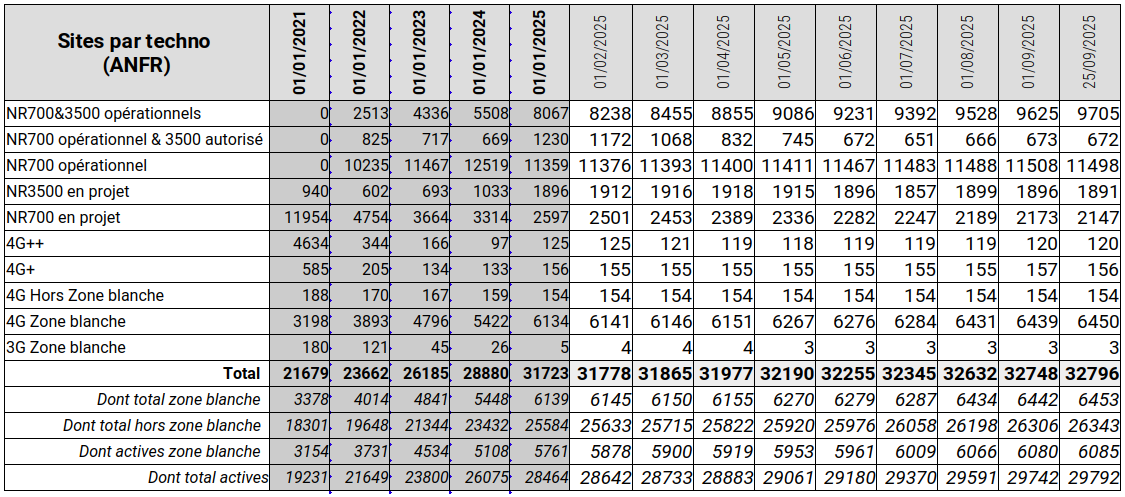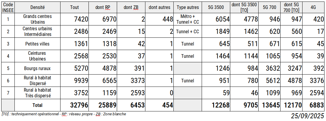 Au 25 septembre 2025, 79,0% des sites étaient équipés et 13% étaient susceptibles de bénéficier, en zone dense, de l’effet « intersite », soit ~93% des sites capables de distribuer un débit variant de 650-850 Mbps en intersite à 1,8 Gbps pour un site intégrant les technologies les plus performantes.