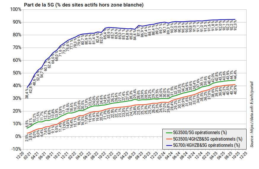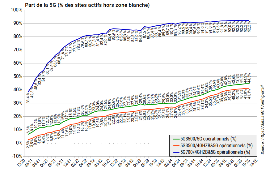 Déploiement de la 5G (% sites actifs hors zone blanche)