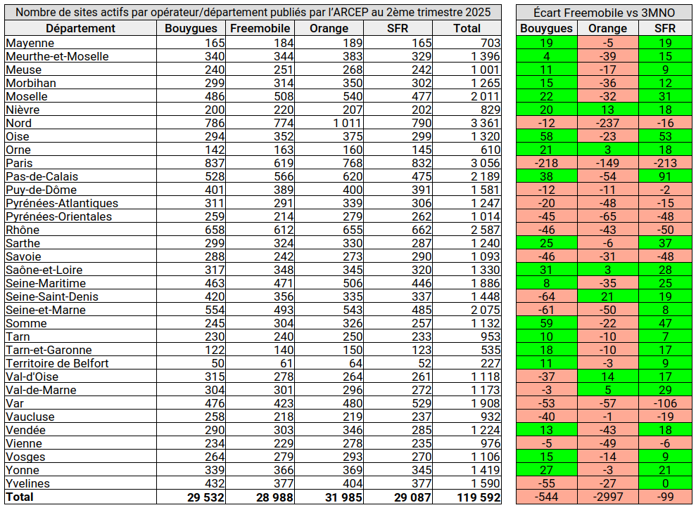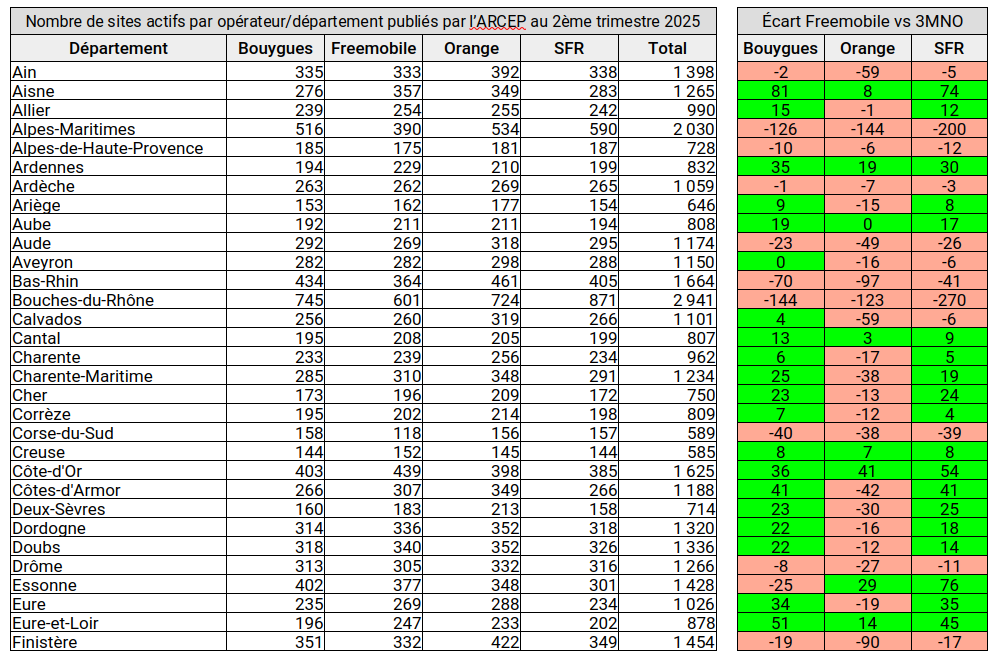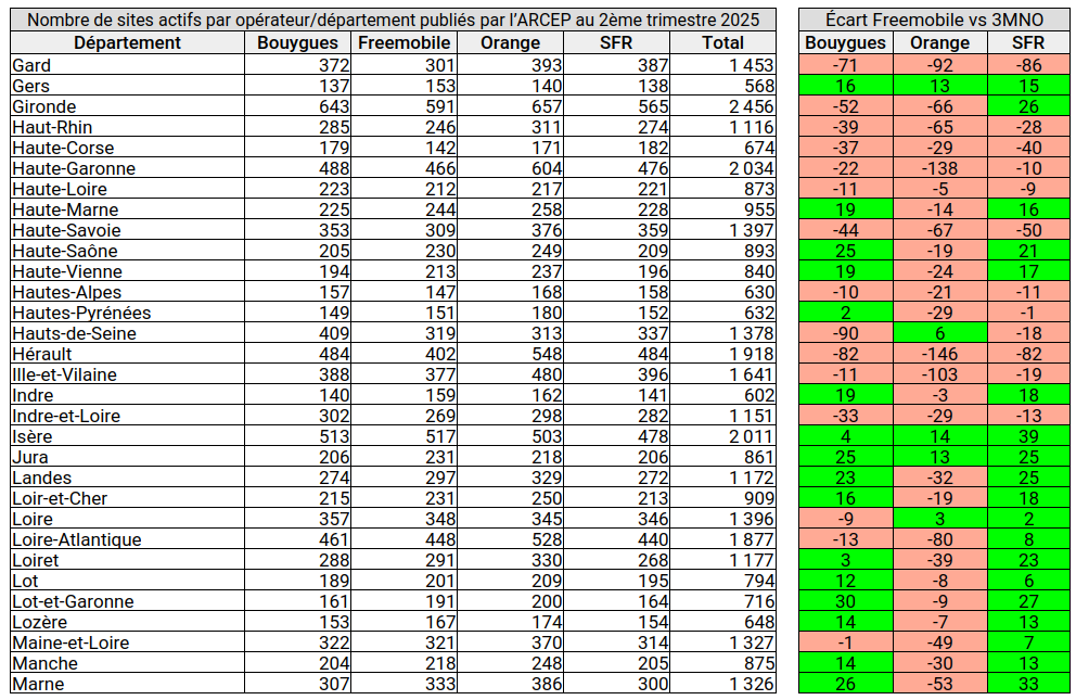 Par rapport aux deux autres opérateurs, Freemobile dispose de plus de sites opérationnels dans une majorité de départements (59 pour le premier et 60 pour le deuxième).