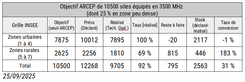 Objectif ARCEP (10500 sites opérationnels en 3500 GHz au 01/01/2026)