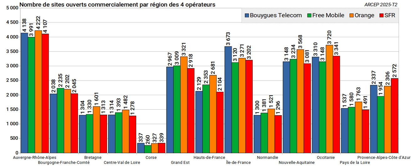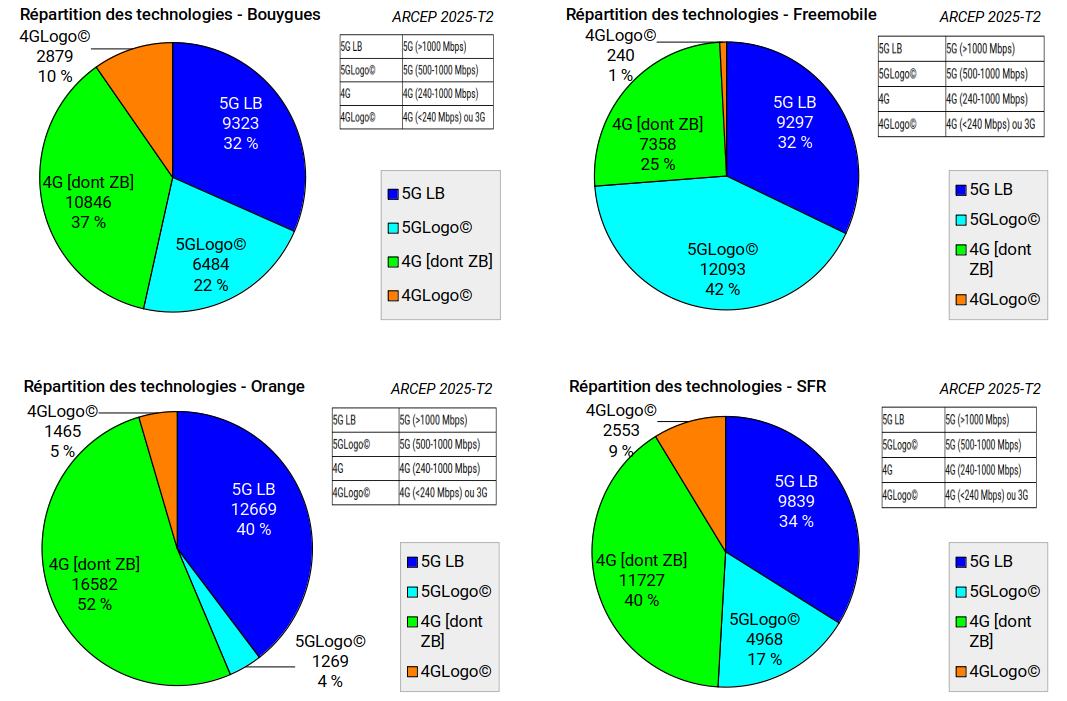 Au 1er août 2025, 77,9% des sites étaient équipés et 14% étaient susceptibles de bénéficier, en zone dense, de l’effet « intersite », soit ~92% des sites capables de distribuer un débit variant de 650-850 Mbps en intersite à 1,8 Gbps pour un site intégrant les technologies les plus performantes.