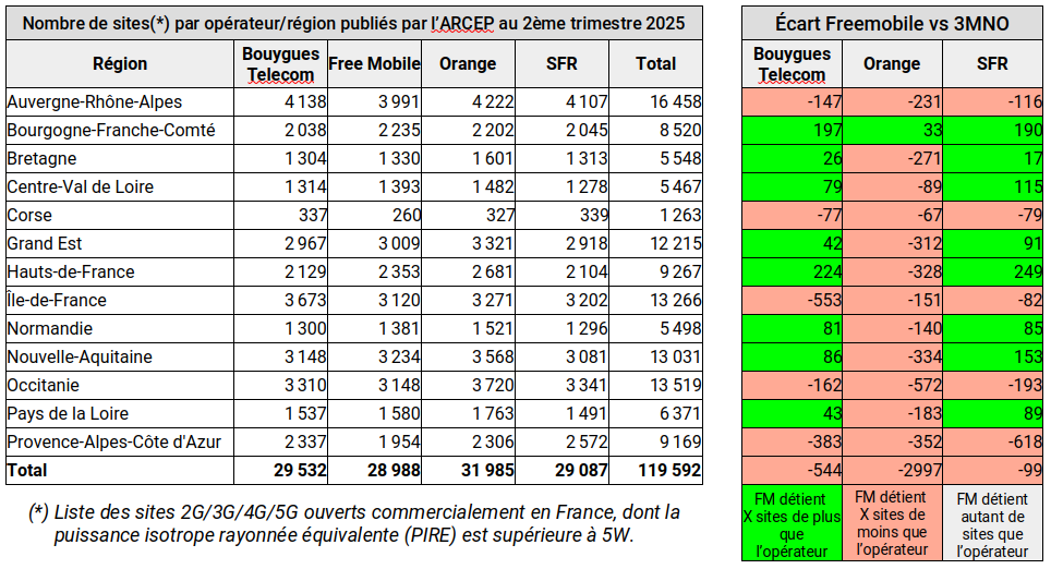 En revanche, en référence aux deux autres opérateurs, Freemobile dispose de plus de sites opérationnels dans 8 régions sur 13 et même dans 9 pour l’un d’entre eux.
