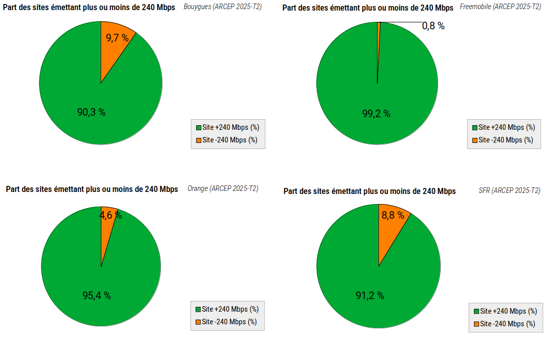 Poids des sites disposant d’une capacité théorique d’émission de plus ou moins 240 Mbps par secteur au 1er trimestre 2025