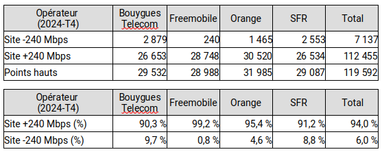 99% des sites de Freemobile émettent avec une capacité de plus de 240 Mbps, contre 95% pour Orange, 89% pour SFR et 90% pour Bouygues.