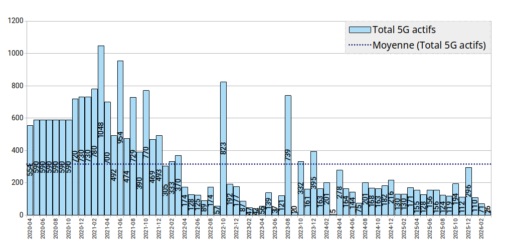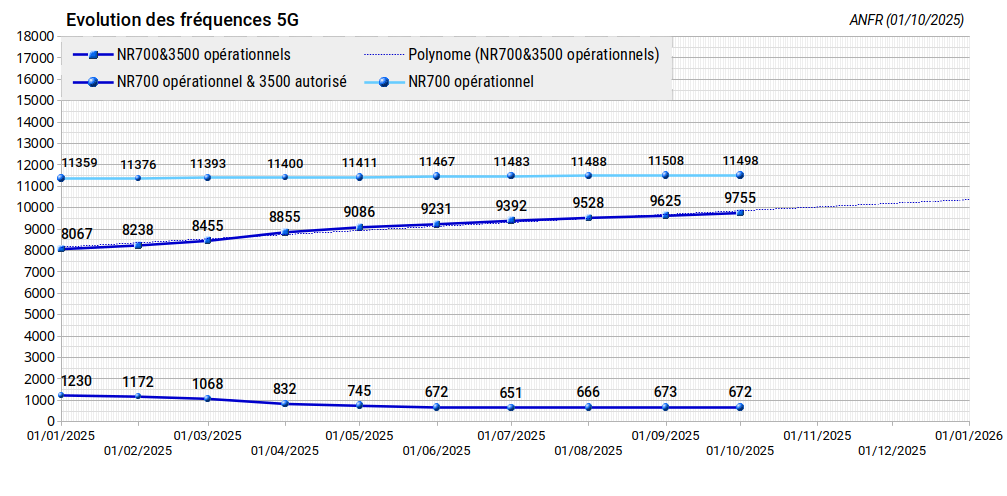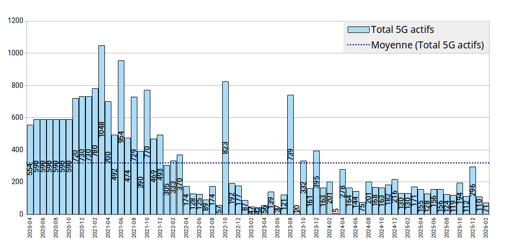 Évolution mensuelle des fréquences 5G depuis le 01/01/2025