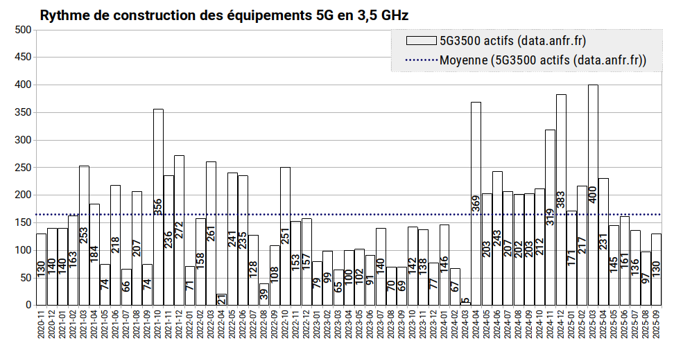 Le respect de l’objectif de mise en service de 10500 sites émettant en 3,5 GHz avant la fin 2025 suppose la poursuite de cet effort à un rythme de livraison mensuelle supérieur à 200.