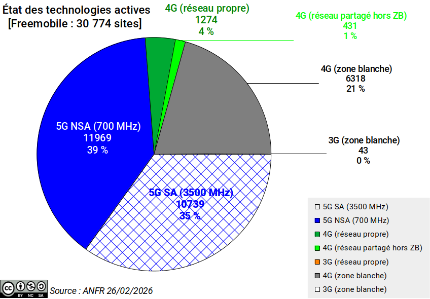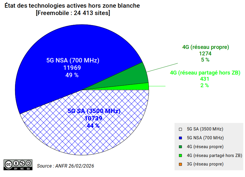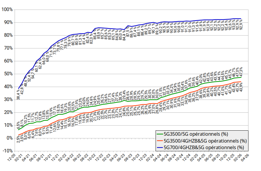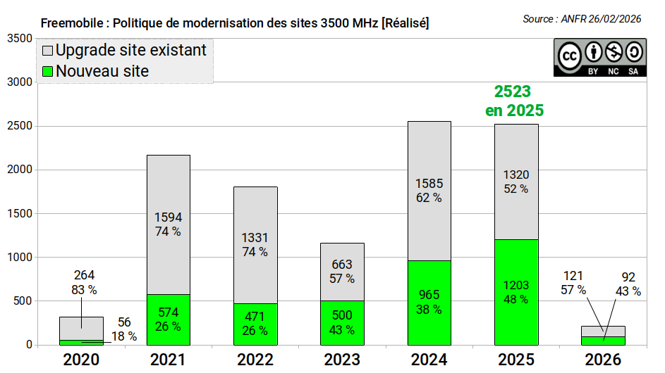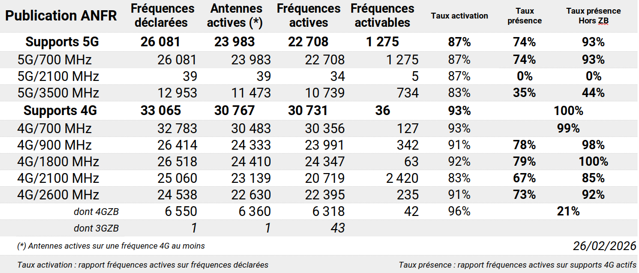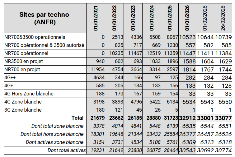 Au 26 février 2026, 83,4% des sites étaient équipés et 10,6% étaient susceptibles de bénéficier, en zone dense, de l’effet « intersite », soit ~94% des sites capables de distribuer un débit variant de 650-850 Mbps en intersite à 1,8 Gbps pour un site intégrant les technologies les plus performantes.