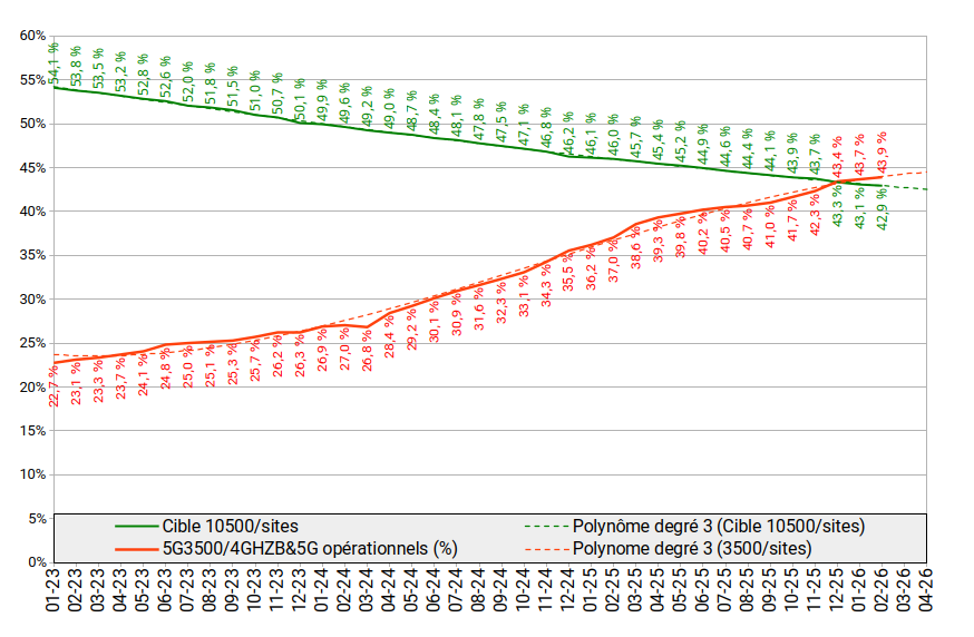 Courbe verte : Les 10500 sites à activer en 3500 MHz au 1er janvier 2026 représentaient 54,1% des sites actifs au 1er janvier 2023. Ils n’en représentent plus que 43,9% en raison de la politique active de déploiement de nouveaux sites (dont près d’un sur deux est équipé en 3500 MHz).