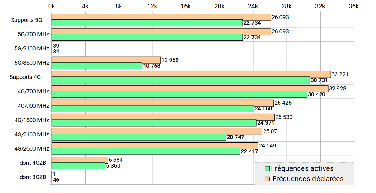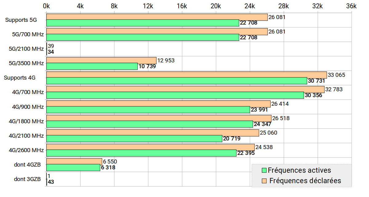 NB : Les sites en zone blanche ne participant pas au déploiement de la 5G, ils sont donc défalqués des calculs (5 310 sites actifs en zone blanche sur un total de 26 854 sites actifs).