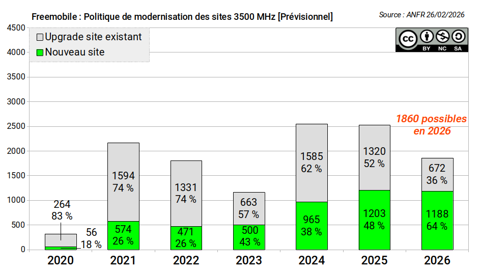 Freemobile dispose d’un portefeuille de 1480 nouveaux sites en projet approuvé (prévus avec la fréquence 3500 MHz) et de 734 sites existants (également programmés en large bande).