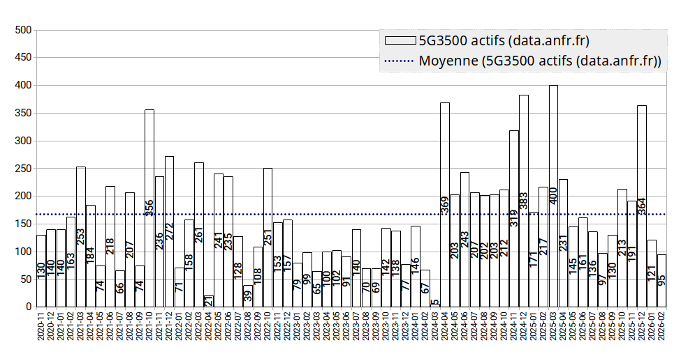 Les graphiques ci-dessus sont basés sur les fichiers ANFR publiés sur une base hebdomadaire et non sur la version papier. A titre indicatif, le dernier graphe établi à partir de la version papier publiée mensuellement figure ci-dessous :