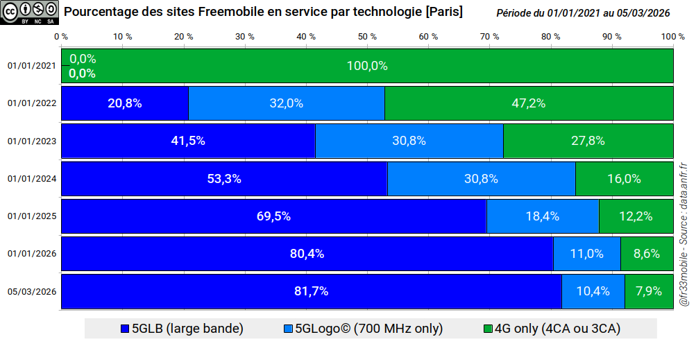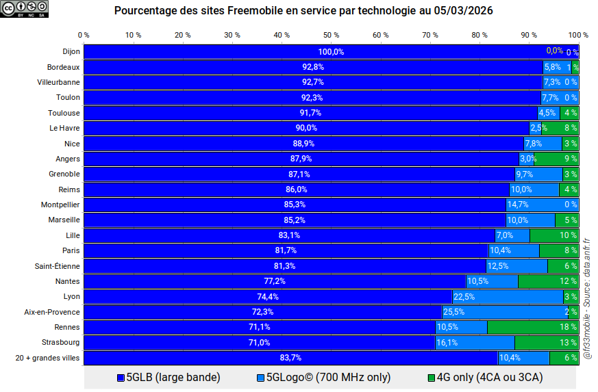 Au 5 mars 2026, 83,7% des sites étaient équipés et 10,4% étaient susceptibles de bénéficier, en zone dense, de l’effet « intersite », soit ~94% des sites capables de distribuer un débit variant de 650-850 Mbps en intersite à 1,8 Gbps pour un site intégrant les technologies les plus performantes.