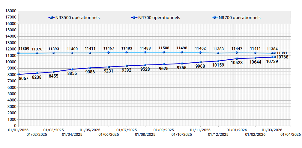 Courbe verte : Les 10500 sites à activer en 3500 MHz au 1er janvier 2026 représentaient 54,1% des sites actifs au 1er janvier 2023. Ils n’en représentent plus que 43,7% en raison de la politique active de déploiement de nouveaux sites (dont près d’un sur deux est équipé en 3500 MHz).
