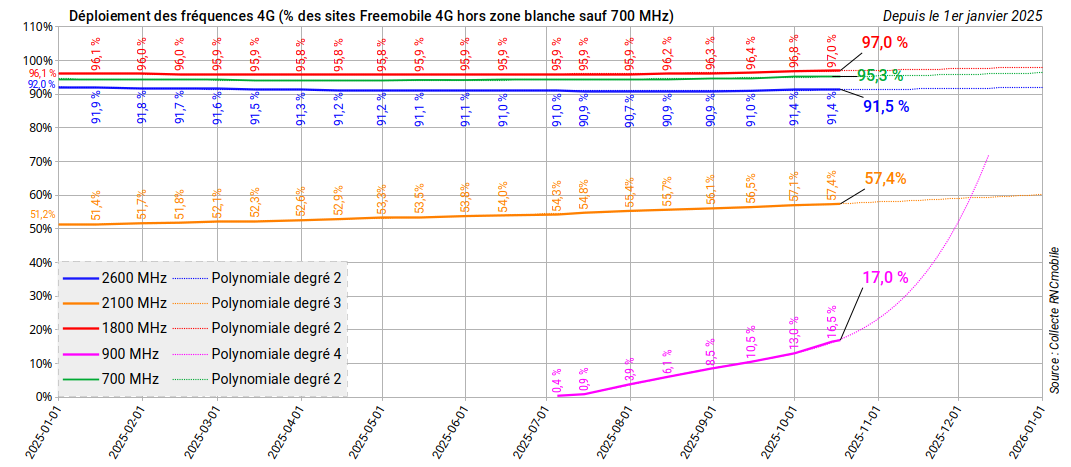 Il semble que depuis fin 2024, les antennes situées en zone très peu dense (zones à habitat dispersé et très dispersé de l’INSEE), ne disposent plus de cette fréquence, notamment lorsque Freemobile est contraint par l’ARCEP d’équiper ces sites dans le seul objectif de respecter le quota de 25% de la décision d’attribution du 3500 MHz.