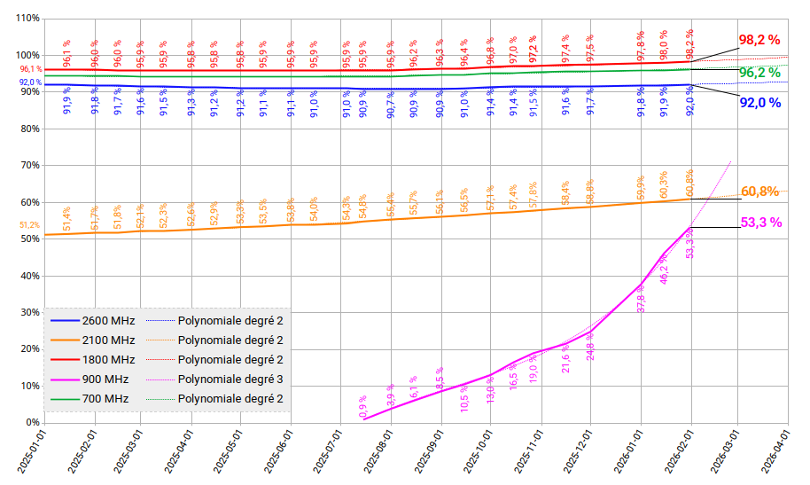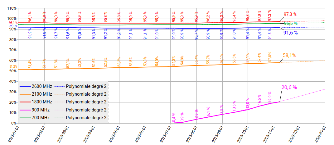 Évolution en pourcentage des 5 fréquences utilisées en 4G