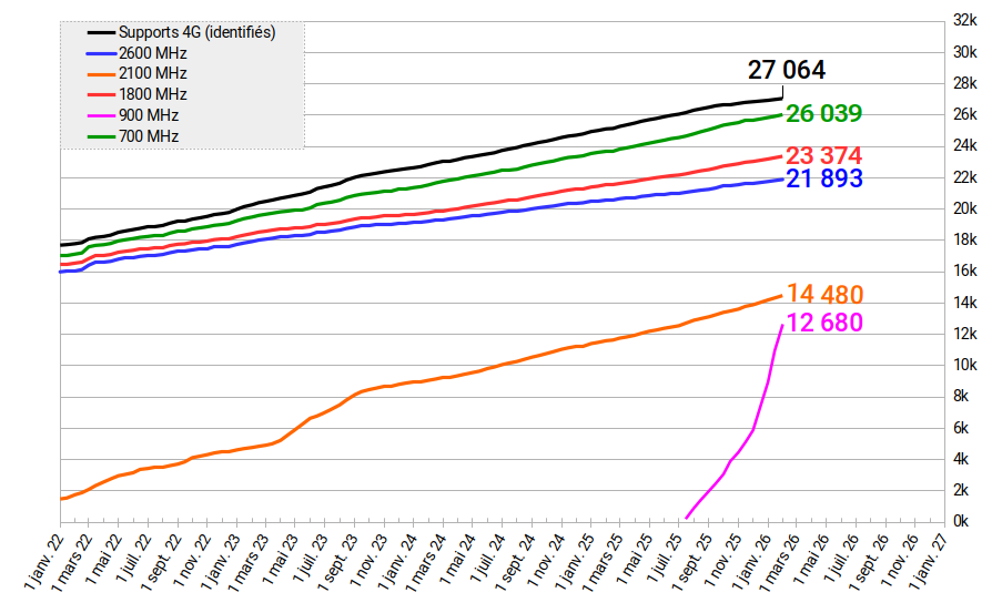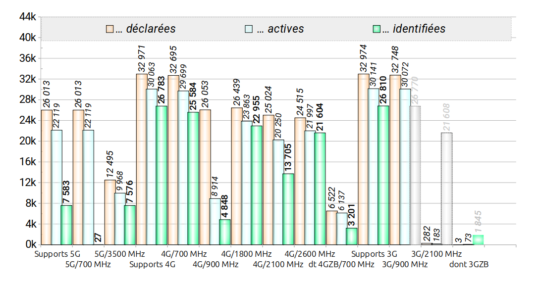 (*) Une partie des fréquences 2100 MHz n’est pas détectable (activation massive de plus de 7000 sites en mai 2024).
