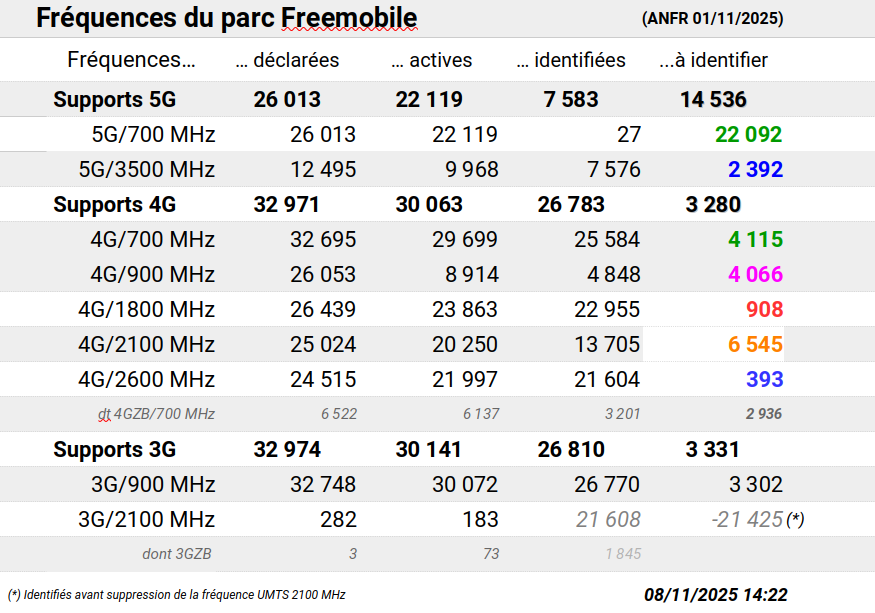 Il semble que depuis fin 2024, les antennes situées en zone très peu dense (zones à habitat dispersé et très dispersé de l’INSEE), ne disposent plus de cette fréquence, notamment lorsque Freemobile est contraint par l’ARCEP d’équiper ces sites dans le seul objectif de respecter le quota de 25% de la décision d’attribution du 3500 MHz.