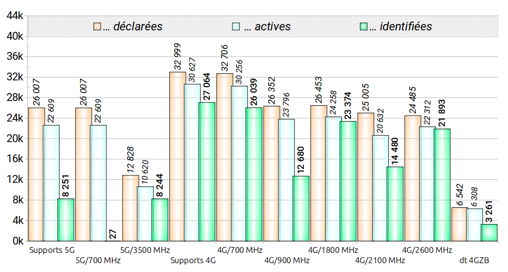 Grâce à la zone blanche, le nombre des sites équipés en 4G/700MHz dépasse largement celui des sites équipés en 4G/1800MHz, qui lui-même dépasse le nombre des sites équipés en 4G/2600 MHz. L’écart est de moins de 1000 sites entre ces deux fréquences.
